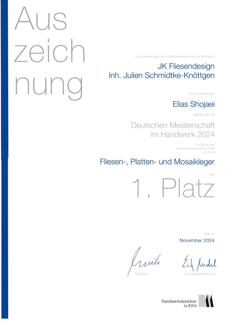 Unser Azubi holt den 1. Platz bei der deutschen Meisterschaft im Handwerk: Fliesen,- Platten,- & Mosaikleger