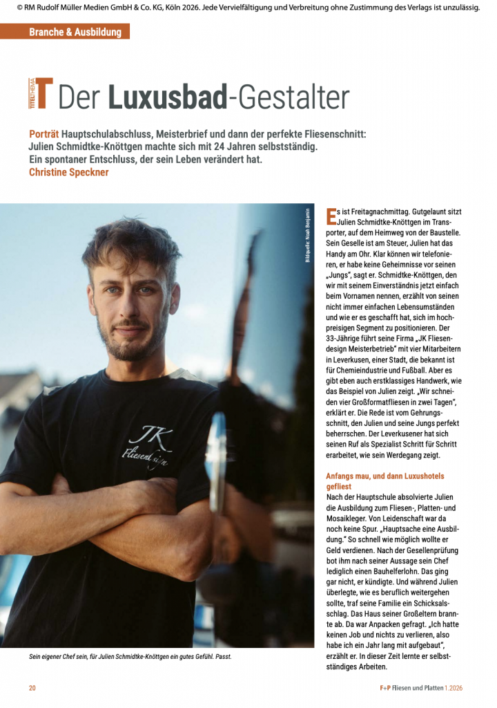 Seine Arbeit wurde im Fachmagazin Fliesen & Platten unter der Überschrift „Der Luxusbadgestalter“ porträtiert – eine Auszeichnung für Spezialisierung, Qualität und gestalterischen Anspruch.